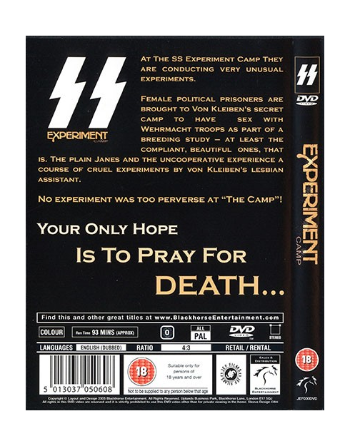 SS Experiment camp was Previously banned! Legally available for the first time. At the SS Experiment Love Camp they are conducting very unusual experiments. Female political prisoners are brought to Von Kleiben's secret camp to have sex with Wehrmacht troops as part of a breeding study - at least the compliant, beautiful ones, that is. The plain Janes and the uncooperative experience a course of cruel experiments by Von Kleiben's lesbian assistant. No experiment was to perverse at the love camp! Your Only Hope Is To Pray For Death... SS Experiment Love Camp is an infamous grindhouse Nazi sex flick, previously banned in the UK as a video nasty!